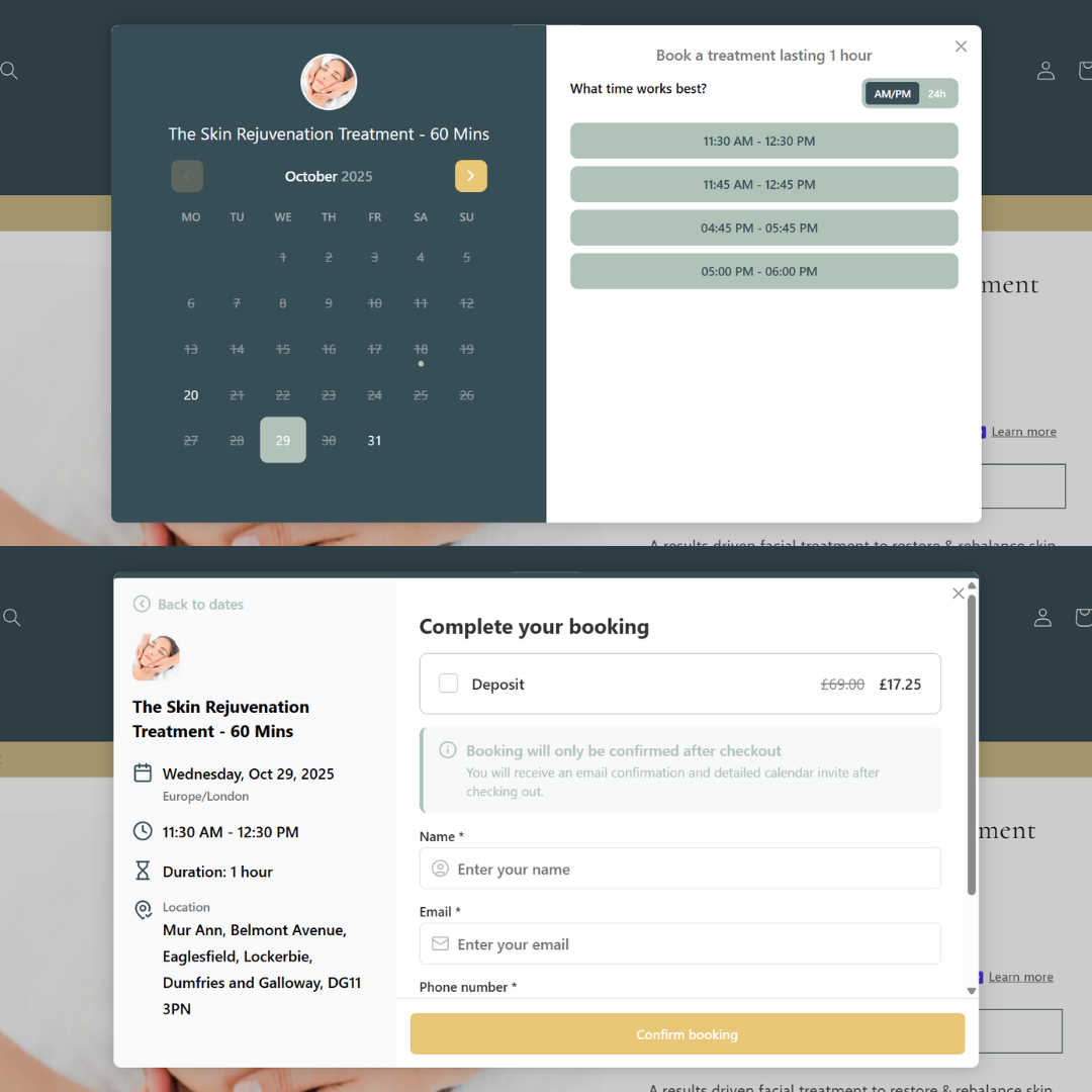 The project brought together two key elements: a high-performing Shopify store for products, and a fully integrated booking system for treatments - creating one unified customer journey.